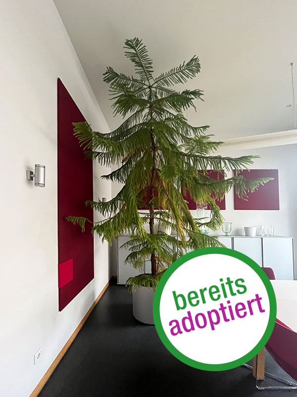 Die ca. 3 Meter große „Wanda Woodini“ ist zwar eine echte Verwandungskünstlerin. An ihrem beständigem Wachstum jedoch kann sie nichts ändern. So stößt sie mittlerweile gegen die Decke. Sie ist gesund und hat ihre ersten braunen Nadeln nur durch „äußere Umstände“, wie Lichtmangel. Zwar erwog sie bereits das Färben ihrer Nadeln, nahm aber schnell davon Abstand und trägt ihr erstes „braun“ mit Würde im Wissen, das ein geeigneter Standort schnell Abhilfe schafft.