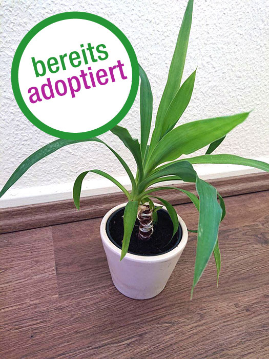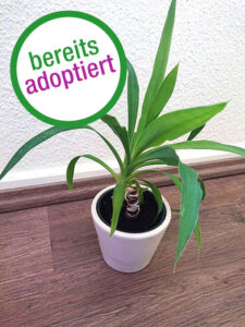 Die 1,40 Meter hohe tanzaffine Madagaskarpalme „Tiny Dancer“ sucht ein neues Heim. Sie ist genügsam, braucht aber Sonne. Als Wolfsmilchgewächs eignet sie sich nicht für Haushalte mit Katzen. Ihre Stacheln sind bemerkenswert – eine Methode der Ganzkörperakupunktur wird gerade an ersten Versuchspersonen verifiziert.