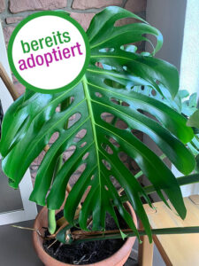 Die fast 30-jährige friedliebende Mon sucht ein neues zu Hause. Ihre beiden Blätter messen je einen ganzen Meter! Ihre Höhe mit Topf beträgt 1,70 Meter. Mon ist also sehr ausladend und braucht viel Platz. Vom Wesen her ist sie einladend, indem sie mit ihrer Güte jedem aus vollen Blattadern willkommen heißt. Die Erstgeborenen ihrer spanischen Vorfahren hießen alle Monteiro. Inzwischen verwendet ihre Familie die Kurzform Mon.